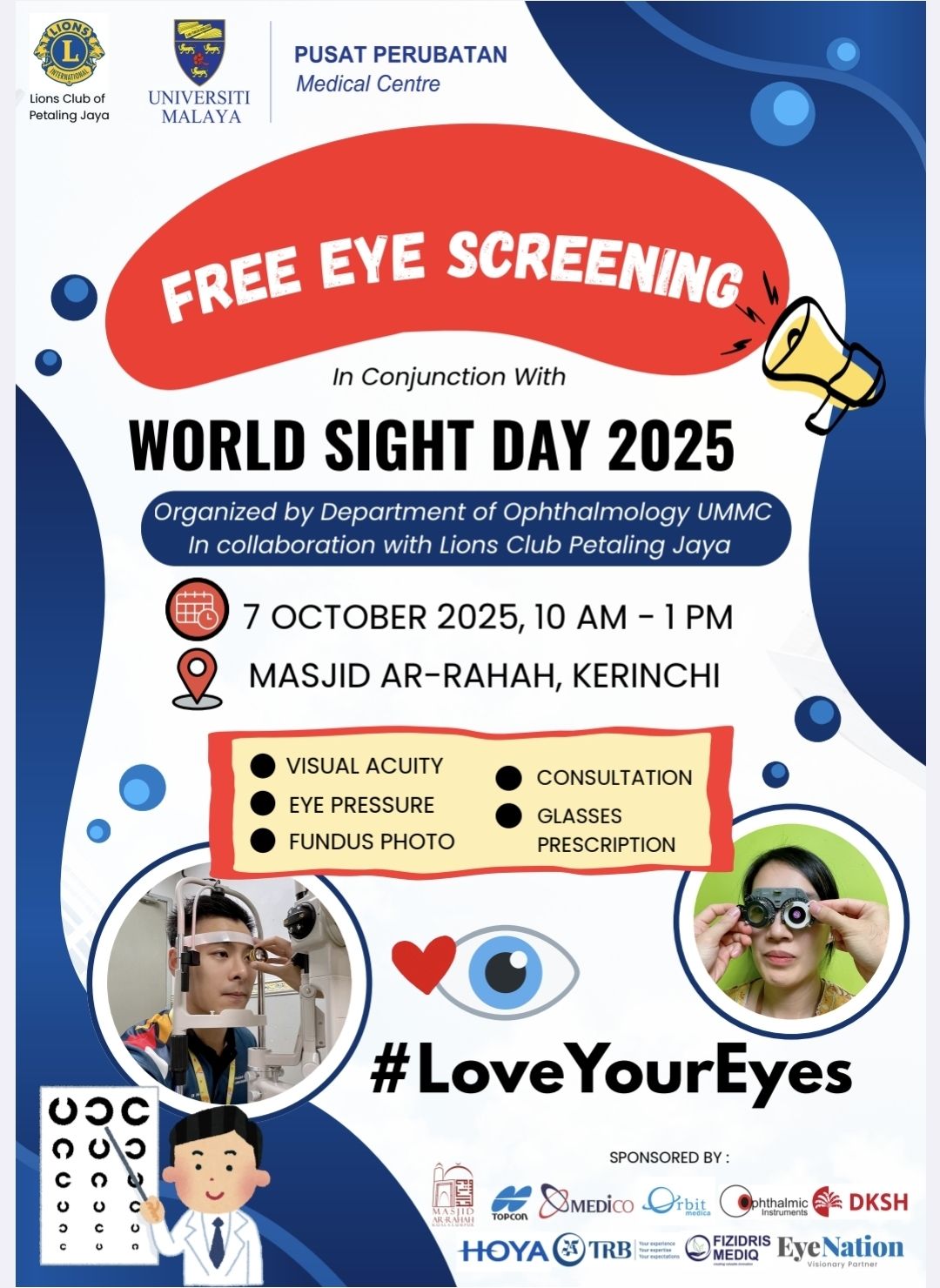 However, despite months of swimming against the currents, the team, led by Dr Lim Yi Wen, was in high spirits on the event day. It was clear as day that talking to the community and promoting good visual hygiene were at the core of all our passions. Teamwork with an enthusiastic group, including Lions Club PJ, Lux Vision Optometry and Sentul Optical Centre, was effortless. Our sponsors outdid themselves and helped provide us with machines, eyedrops and visual aids. We even had a pickle stall to add some flavour throughout the event. Members of Masjid Ar-Rahah congregation were eager to learn more about their visual health and were incredibly welcoming to all of us. At the end of the event, we had successfully screened 85 members of the public, and the Lions Club of PJ had dispensed over 20 new prescription glasses to the needy.